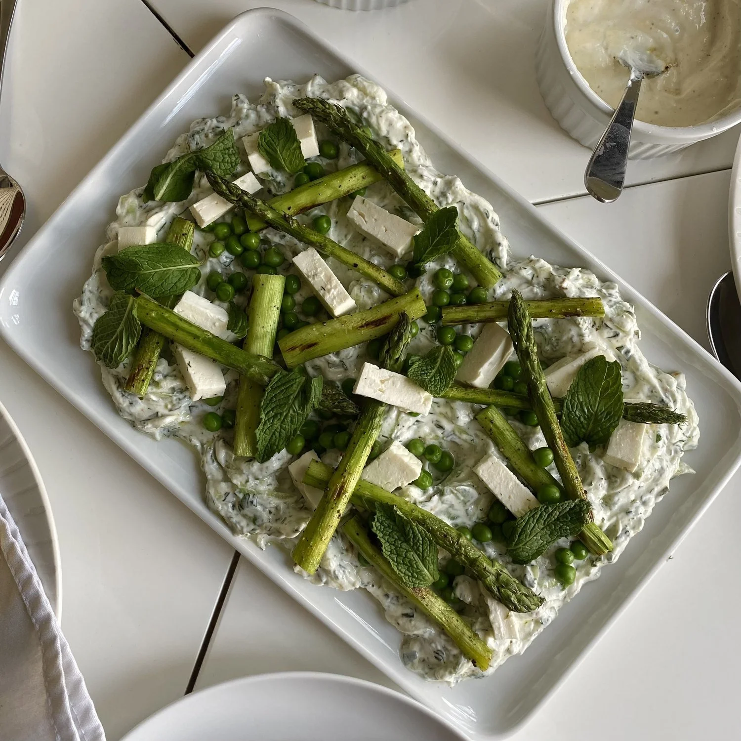 To assemble, spread a layer of the cucumber and yogurt mixture on a platter, top with the defrosted peas, cubed feta, mint leaves, and cooked asparagus.